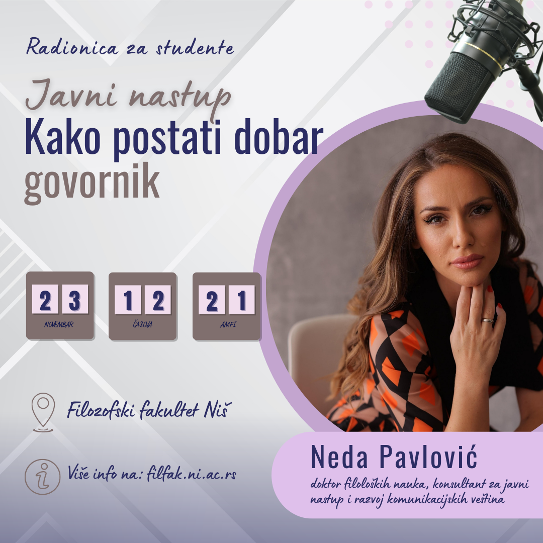 Радионица 'Како постати добар говорник' намењена је студентима свих нивоа студија Филозофског факултета у Нишу. Радионицу ће реализовати Неда Павловић, доктор филолошких наука, консултант за јавни наступ и развој комуникацијских вештина.