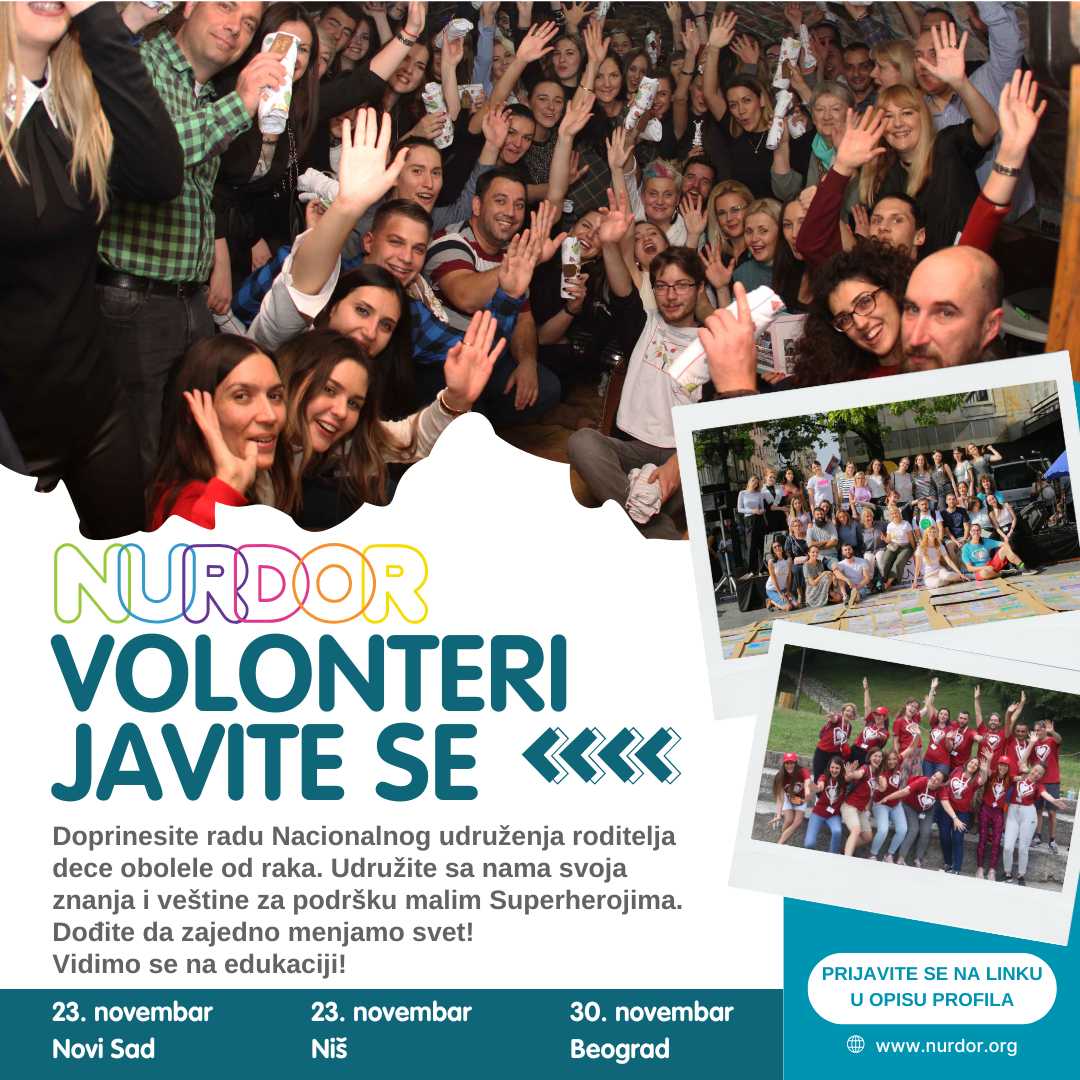 Националном удружењу родитеља деце оболеле од рака, НУРДОР су потребни волонтери за помоћ при обављању административних послова, за активности у вези побољшања квалитета живота деце оболеле од рака и њихових породица, за помоћ у информисању и сензибилисању јавности, за помоћ при организацији јавних скупова и догађаја и за помоћ око прикупљања средстава, за учешће у рехабилитационим камповима за децу након лечења.