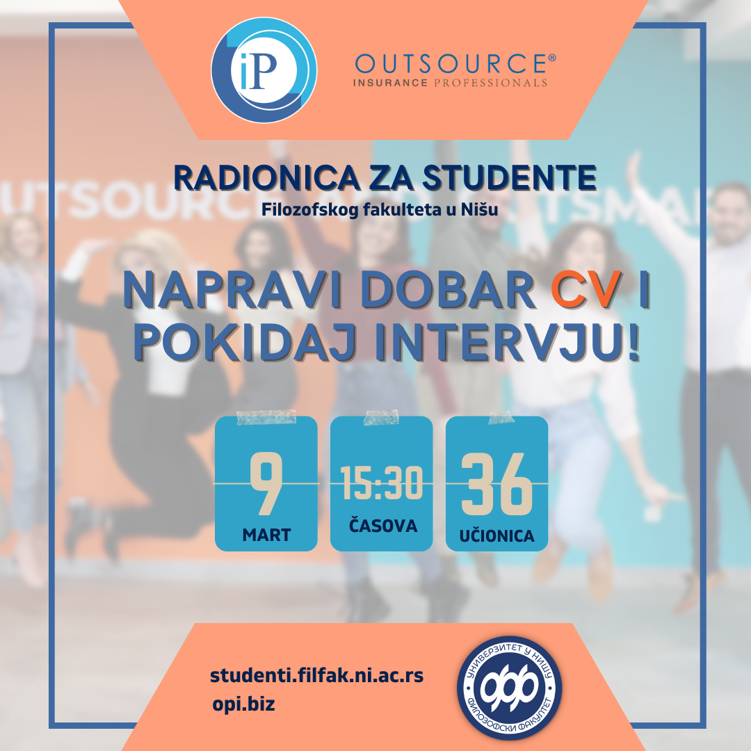 Радионица Направи добар CV и покидај интервју! намењена је студентима свих нивоа студија Филозофског факултета у Нишу. Радионицу ће реализовати запослени компаније OIP (Outsource insurance professionals), Лука Ристовић (VP of Operations), Милица Рајковић Ристовић (PR Manager), Ивана Дејановић (Talent Acquisition Associate), Соња Живадиновић (HR Administrator).